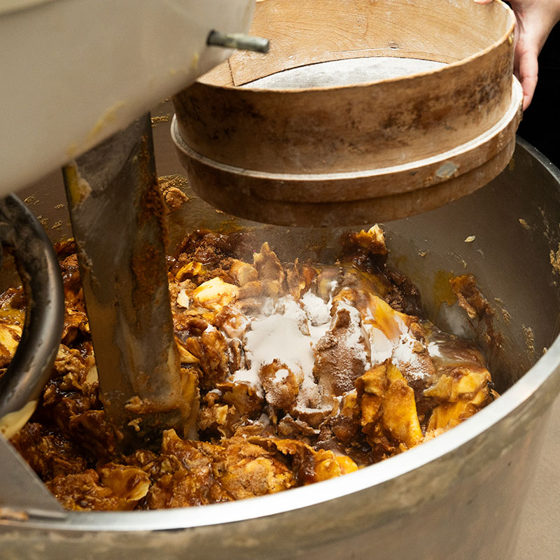Alles begint met de juiste ingrediënten. Bloem, suiker en rijsmiddel komen in zakken van 25kg binnen. Daaruit scheppen we de juiste hoeveelheden. De ene dag al wat meer dan de andere, afhankelijk van het aantal bestellingen.