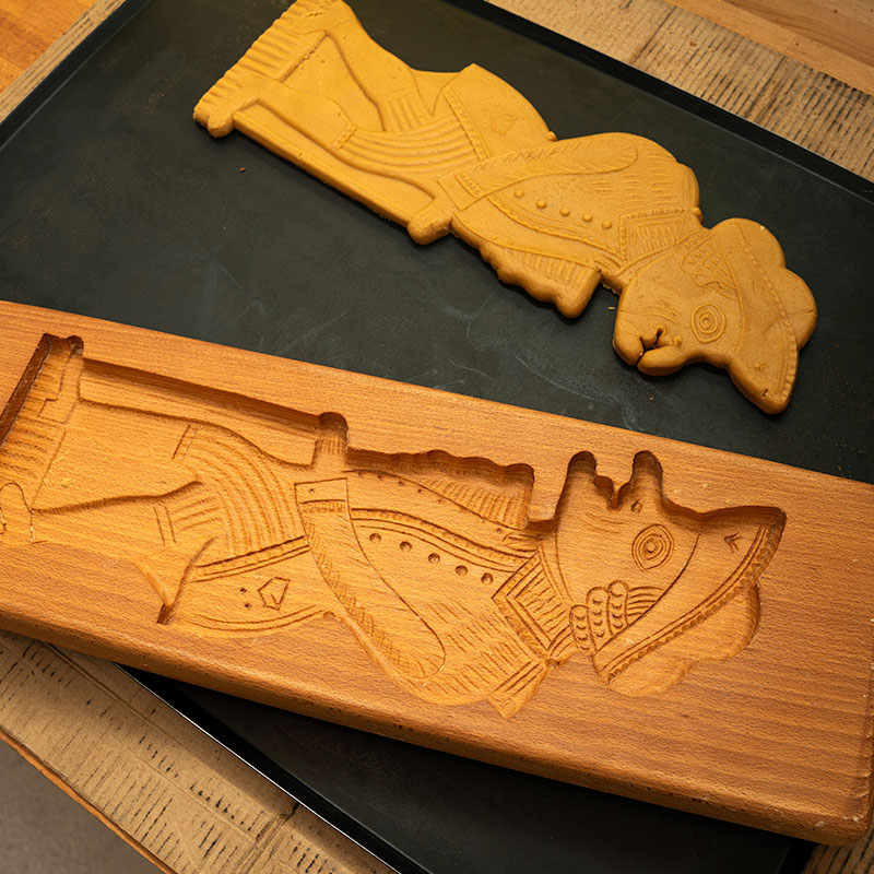 Als alles goed is valt er een mooi gevormde speculaas uit de plank. Als dat niet zo is, gaat het deeg weer bij elkaar en beginnen we opnieuw.